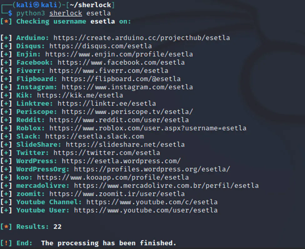 Sherlock - это инструмент командной строки с открытым исходным кодом, разработанный на языке Python, который, подобно Namechk, ищет определенное имя пользователя в наиболее популярных социальных сетях и выдает ссылки на профили. У него нет интерфейса, и доступ к нему осуществляется через командный терминал Windows, Linux или MacOS. Дополнительную информацию и руководство по установке можно найти в репозитории GitHub проекта Sherlock.
