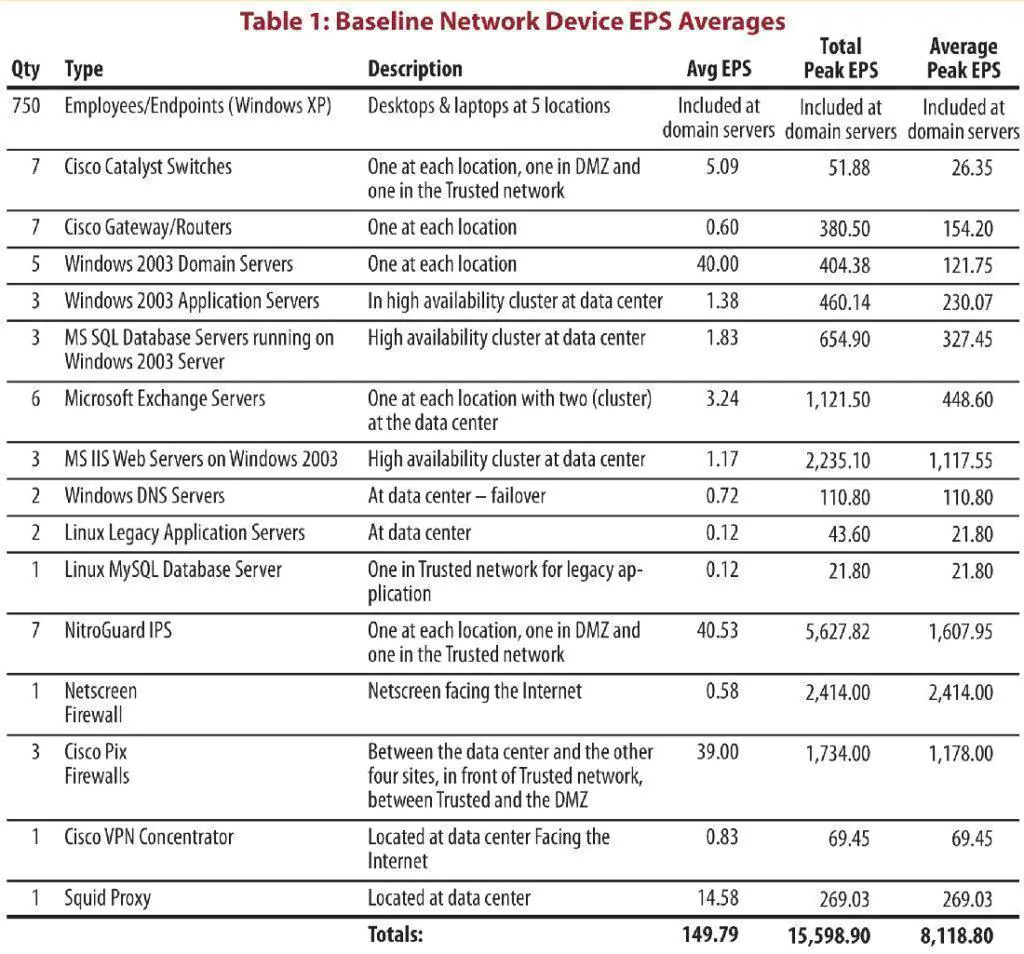 В следующей таблице SANS, показаны типичные средние EPS (нормальные EPS) и пиковые EPS для отдельных сетевых устройств. Этим данным уже несколько лет, но они могут дать приблизительные цифры для ваших первоначальных оценок.