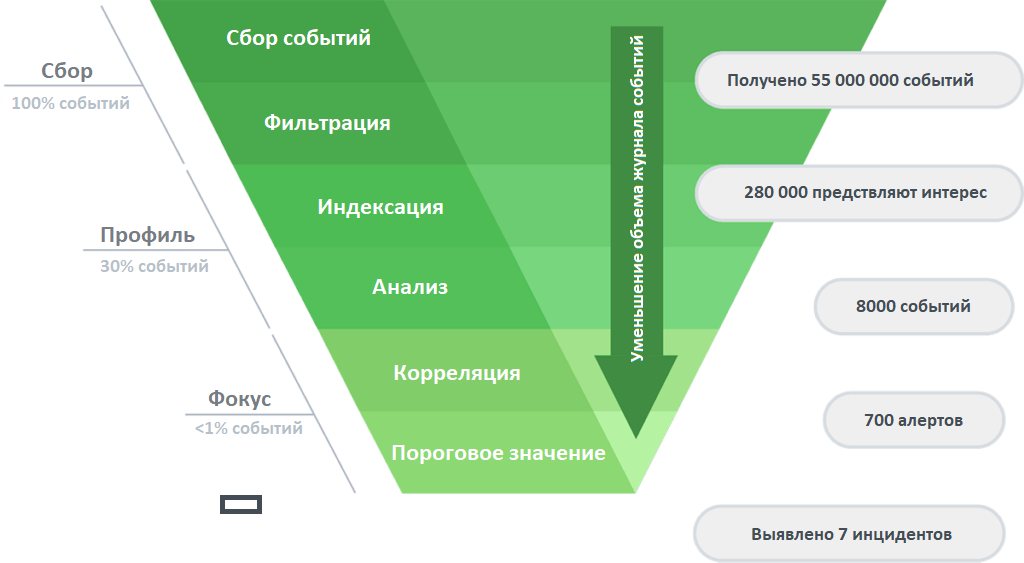 SIEM собирает 100 процентов данных журналов по всей организации. Но затем данные начинают стекать по воронке журналов, и сотни миллионов записей журналов могут быть сведены лишь к горстке действенных предупреждений безопасности.