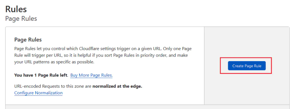 - В разделе Page Rules нажмите Create Page Rule. Откроется диалоговое окно Create Page Rule for <вашего домена>.