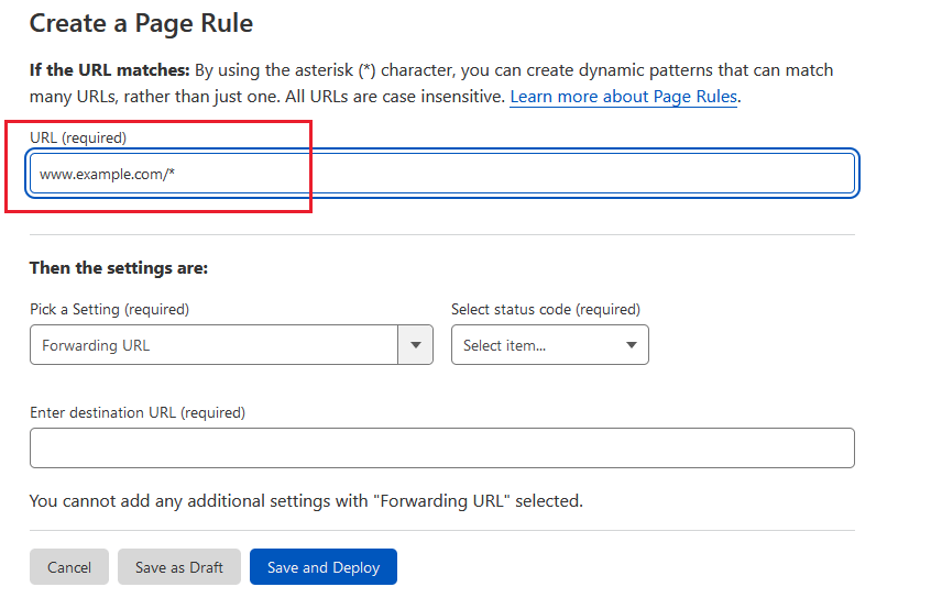 Например, шаблоны URL Page Rule *www.example.com/products и *example.com/products совпадают: