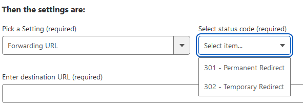 - В разделе Select status code выберите 301 (постоянное перенаправление) или 302 (временное перенаправление).