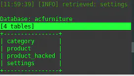 Таким образом, можно сделать вывод, что расположение данных таково, что сайт acfurniture.com имеет две базы данных, acfurniture и information_schema. База данных с именем acfurniture содержит четыре таблицы: category, product, product_hacked и settings. Имя взломанной таблицы отсутствует, но давайте разберемся подробнее. Посмотрим, что находится внутри таблицы settings. Внутри таблицы действительно есть столбцы и данные.