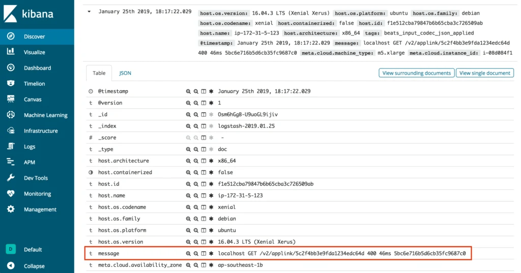 Без Grok, когда журналы отправляются из Logstash в Elasticsearch и отображаются в Kibana, они появляются только в значении сообщения.