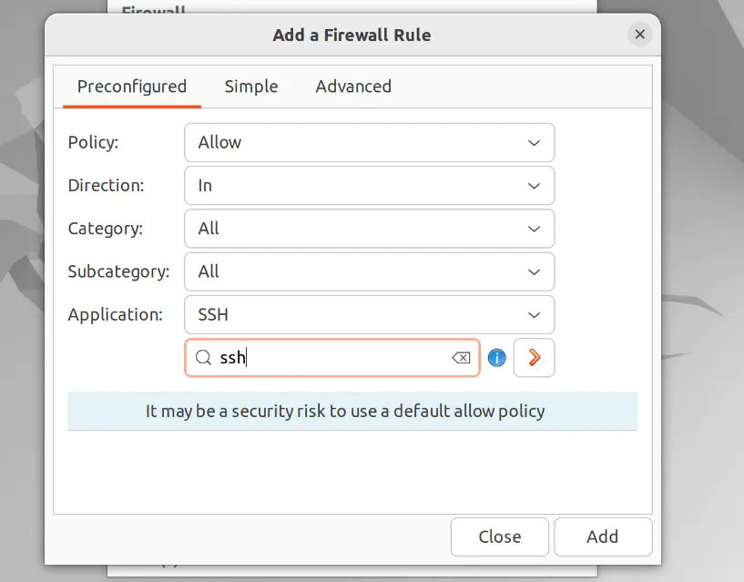 Предварительно настроенные параметры автоматически определяют, на какие порты следует ориентироваться. Например, правило SSH автоматически включает SSH на TCP-порту 22.