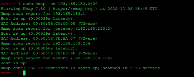 | 1 | sudo nmap -sn 192.168.153.0/24 |