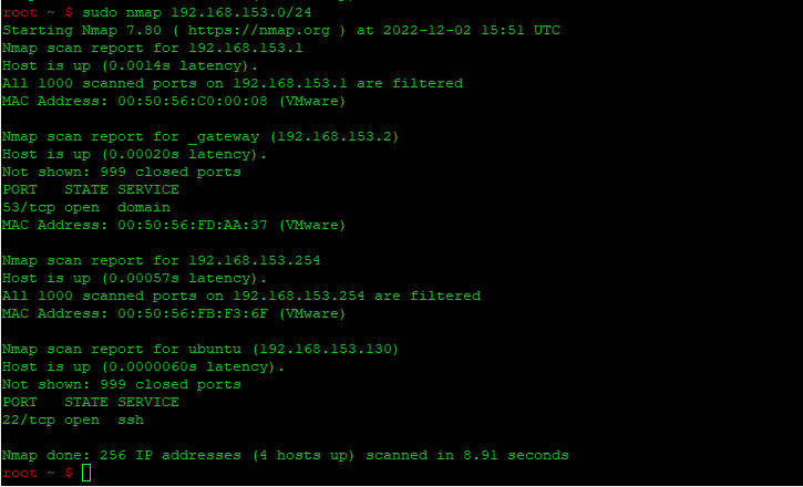 | 1 | sudo nmap 192.168.153.0/24 |