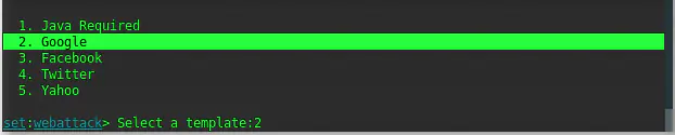Итак, мы задали наш метод и IP-адрес слушателя. В этой опции перечислены предопределенные шаблоны веб-фишинга, о которых я говорил выше. Поскольку нашей целью является страница аккаунта Google, выбираем номер 2. Google. Нажимаем ENTER.
