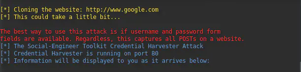 Теперь SET запускает мой веб-сервер Kali Linux на порт 80 с поддельной страницей входа в аккаунт Google. Наша настройка завершена. Теперь я готов зайти в комнату своих друзей и войти на эту фишинговую страницу, используя свой мобильный телефон.