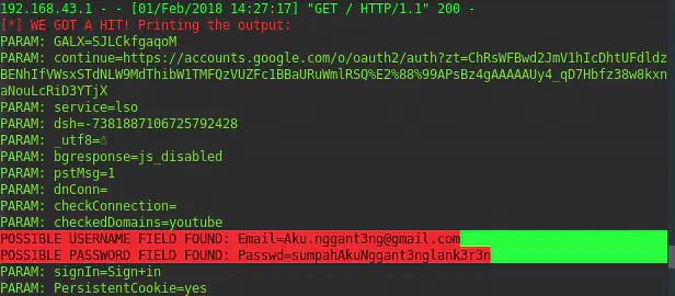 Как только жертва нажимает кнопку "Войти", она отправляет аутентификационную информацию на нашу машину-слушатель, и она регистрируется.