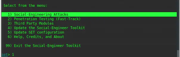 Да, конечно, мы собираемся проводить атаки социальной инженерии, поэтому выберите номер 1 и нажмите ENTER.