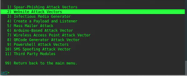 Затем на экране появятся следующие опции, выбираем цифру 2. Website Attack Vectors (Векторы атак на веб-сайт). Нажимаем ENTER.