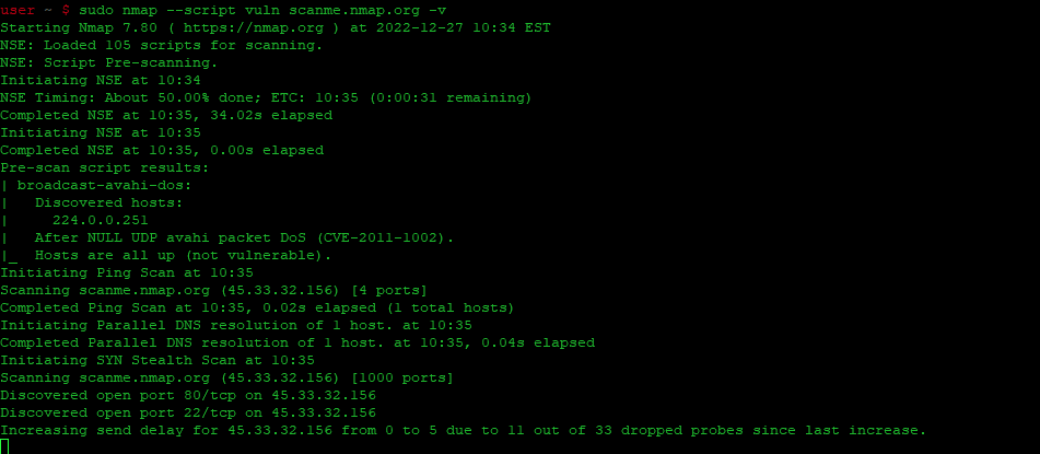 | 1 | sudo nmap --script vuln scanme.nmap.org -v |