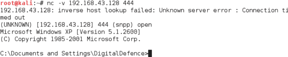 Для удаленного доступа к скомпрометированной системе введите в командной строке команду $nc, укажите степень подробности соединения (-v и -vv сообщает основную и более подробную информацию соответственно), а затем введите IP-адрес цели и номер порта.
