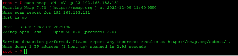 - 1sudo nmap -sN -sV -p 22 192.168.153.131