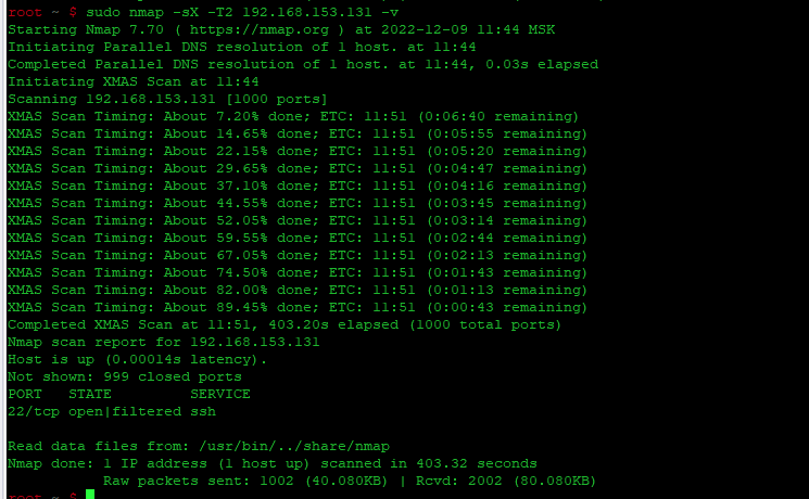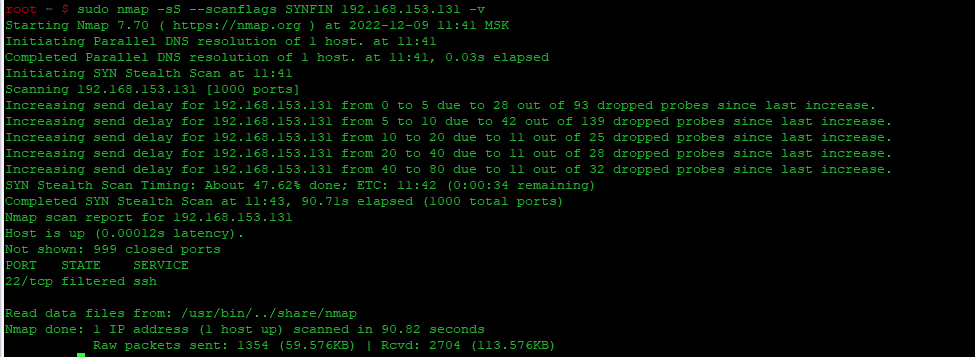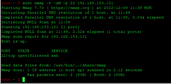 | 1 | sudo nmap -v -sN -p 22 192.168.153.131 |