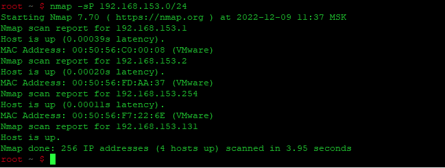 | 1 | nmap -sP 192.168.153.0/24 |