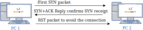 На следующем рисунке показано скрытое сканирование с пакетами SYN. Как вы видите, последний пакет подтверждения (ACK), отправленный PC1 (Nmap), заменяется пакетом RST, прерывая соединение для обхода брандмауэров (системы обнаружения вторжений и пользовательские брандмауэры обнаружат скрытое сканирование).