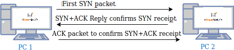 Как показано на рисунке ниже, обычное TCP-сканирование состоит из начального пакета SYN (синхронизация) от Nmap (PC1), запрашивающего цель (PC2) о синхронизации соединения. Если целевой порт открыт, цель отвечает пакетами SYN+ACK (подтверждение и синхронизация), подтверждающими прием SYN и синхронизацию с Nmap, а Nmap посылает пакеты ACK (подтверждение) в качестве ответа на SYN цели.