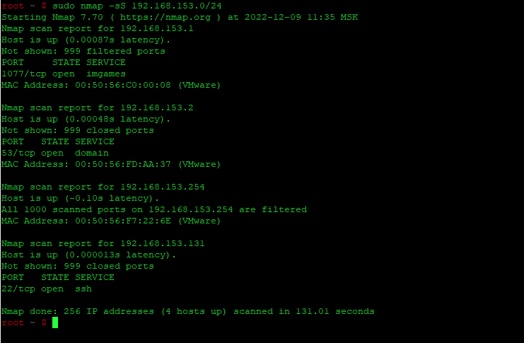 | 1 | sudo nmap -sS 192.168.153.0/24 |