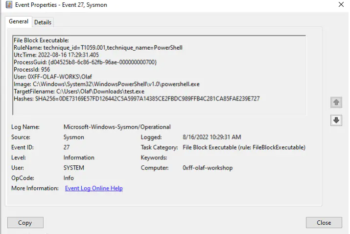 Хотя в командной строке нет ошибки, файл не записывается на диск. Sysmon предотвратил это, как показывает событие ниже.