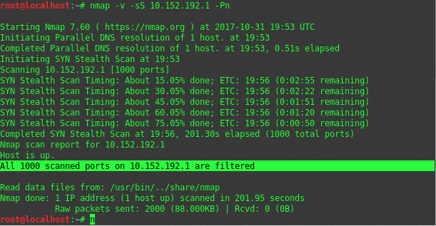 К сожалению, все порты на 10.152.192.1 заблокированы, то есть все входящие TCP-соединения блокируются IPS или Firewall на этом IP. Теперь выполним еще одно сканирование второй цели.