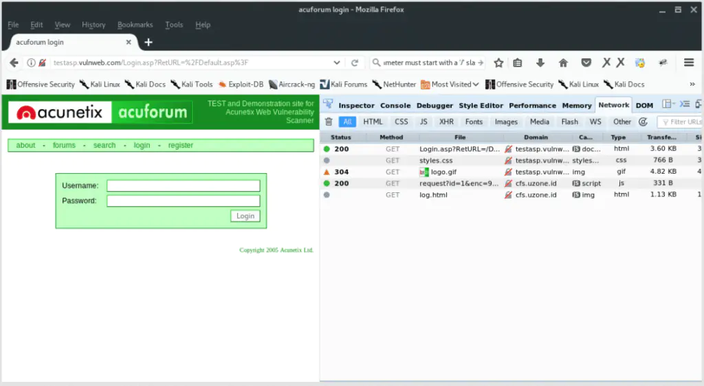 В браузере Firefox нажмите клавиши 'CTRL + SHIFT + Q'. Затем откройте страницу входа в систему http://testasp.vulnweb.com/Login.asp?RetURL=%2FDefault%2Easp%3F, и вы заметите, что на вкладке "Инструменыты разработчика" появился текст. В нем говорится о том, какие файлы нам передаются. Видим, что все они передаются методом GET, так как мы еще не отправляли никаких данных методом POST.