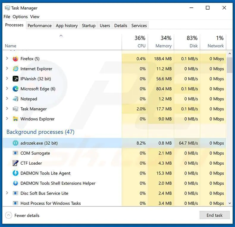Пример процесса вредоносной программы Adrozek в диспетчере задач Windows (название процесса может отличаться):
