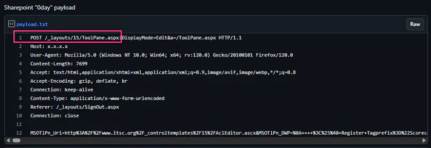 Эксплуатация CVE-2025-53770 начинается с отправки специально сформированного HTTP-запроса к эндпоинту "/layouts/15/ToolPane.aspx", где злоумышленники используют заголовок "Referer" со значением "/_layouts/SignOut.aspx", чтобы обойти механизмы аутентификации. В результате на сервер загружается вредоносный файл "spinstall0.aspx", который извлекает криптографические ключи, включая "ValidationKey" и "DecryptionKey", из конфигурации SharePoint.