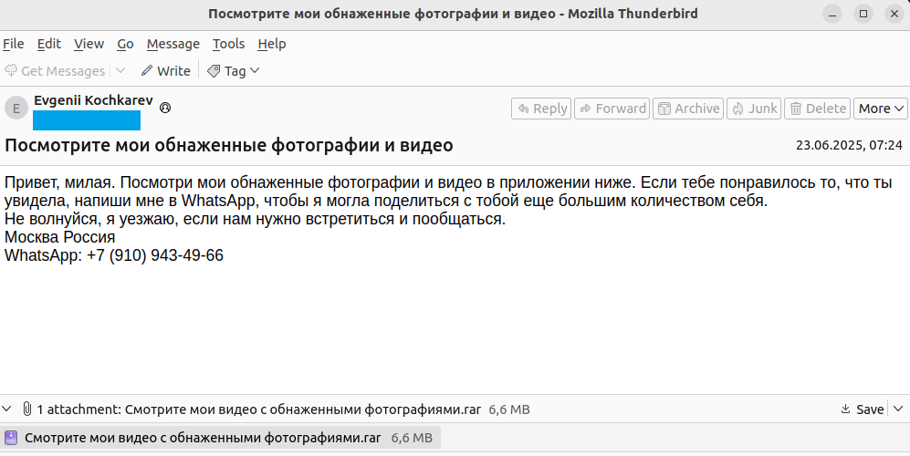 Письма в рамках кампании имели откровенно провокационные названия, такие как «See My Nude Pictures and Videos» или «Прикрепленная копия платежа №06162025». Вложениями выступали RAR-архивы, внутри которых находились образы дисков (ISO или IMG). При их открытии жертва монтировала виртуальный носитель и запускала исполняемый файл, что позволяло злоумышленникам обходить некоторые традиционные механизмы защиты.
