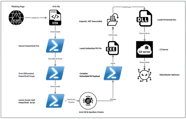 Цепочка заражения начинается с фишинговой кампании на основе CAPTCHA, которую мы идентифицировали как Clickfix (эта техника также использовалась злоумышленниками в июне 2025 года). Файл HTA служит первоначальным загрузчиком, приводя к выполнению файла PowerShell. После декодирования строки в формате Base64 был получен другой сценарий PowerShell, который оказался сильно запутанным, что представляет серьёзную проблему для статического анализа и сигнатурного обнаружения. Вместо использования читаемых строк и переменных он динамически строит команды и значения через сложные математические операции и восстановление строк из массивов символов.