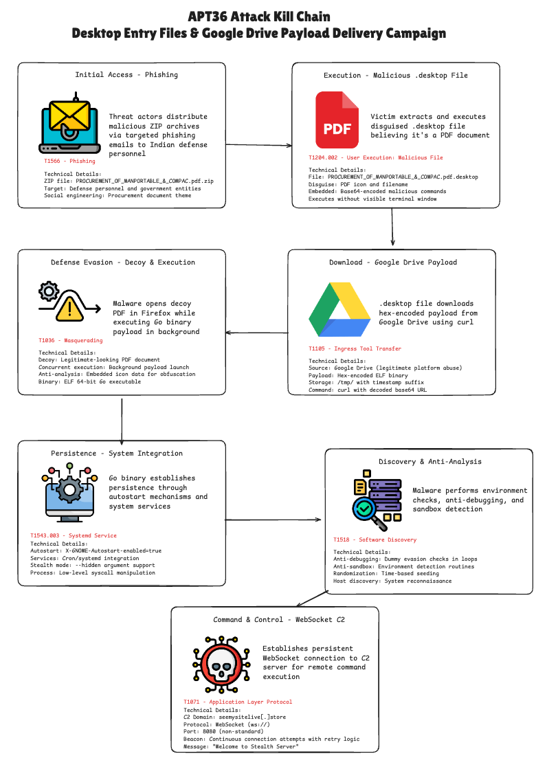 Группа APT36, связанная с Пакистаном и также известная как Transparent Tribe, провела новую кибершпионскую кампанию, направленную на правительственные и оборонные организации Индии. В августе 2025 года злоумышленники использовали фишинговые ZIP-архивы, содержащие вредоносные файлы .desktop для Linux, которые загружали полезную нагрузку с Google Drive. Эта тактика позволила им обеспечить устойчивость на зараженных системах, избежать обнаружения и установить связь с сервером управления через WebSocket.