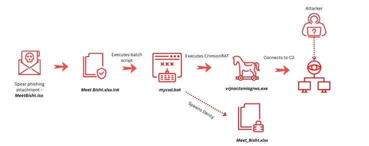 Кампания начинается с целевой фишинговой рассылки. Жертвам отправляется ISO-образ с названием MeetBisht.iso, отсылающим к имени реального основателя стартапа Voldebug. Внутри образа находится вредоносный ярлык (LNK-файл), замаскированный под документ Excel, папка с файлами-приманками, пакетный скрипт и сам вредоносный полезный груз (payload) - троянец Crimson RAT.