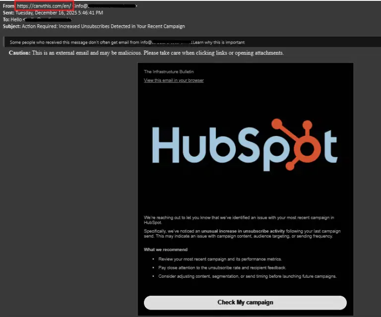 Основным вектором атаки стала рассылка фишинговых писем, которые убедительно имитировали коммуникацию от HubSpot. Сообщение побуждало пользователей проверить маркетинговую кампанию из-за якобы возросшего числа отписок. При этом прямые ссылки в теле письма не были вредоносными. Ключевой обман заключался в другом: фишинговая ссылка была размещена непосредственно в отображаемом имени отправителя. Этот метод часто позволяет обходить проверки защитных шлюзов электронной почты (Secure Email Gateway, SEG), так как системы редко анализируют имя отправителя на наличие URL.