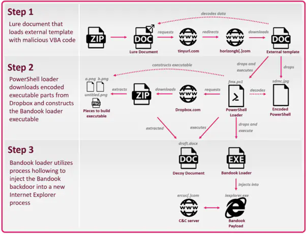 Цепочка процесса заражения Bandook состоит из трех этапов. Процесс начинается с фишинга через документ Microsoft Word с внедренным кодом, поставляемый в формате ZIP-файла.