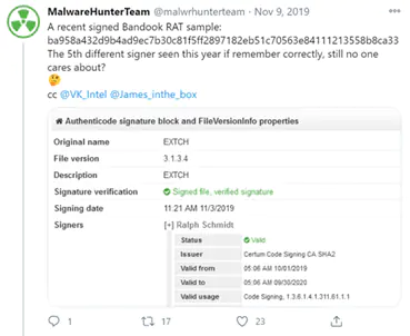 Bandook были замечены в 2019 и 2020 годах с использованием действительных и подписанных сертификатов кода для обхода защитных систем.