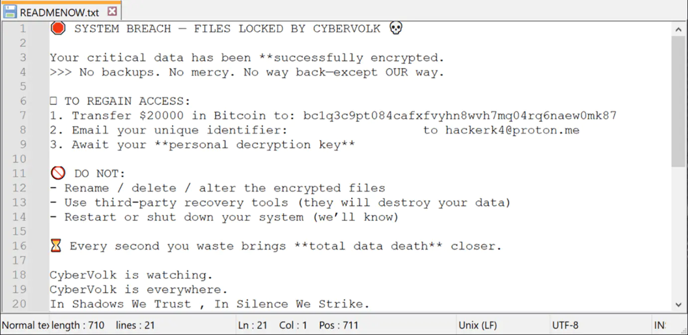 В мае 2024 года появилась новая группа вымогателей CyberVolk, которая атакует государственные учреждения и критически важную инфраструктуру в различных странах. Эксперты по безопасности провели технический анализ внутреннего устройства этого вредоносного ПО, чтобы понять его механизм работы, структуру шифрования и причины, по которым восстановление файлов без оплаты выкупа невозможно.