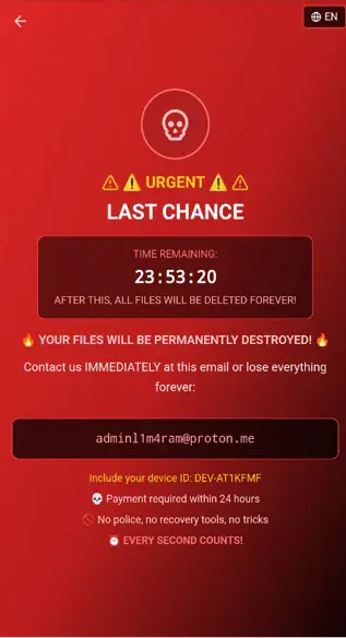 Ключевой функцией является демонстрация на весь экран угрожающего оверлея в стиле программ-вымогателей. Получив команду RANSOMWARE, вредонос выводит сообщение с требованием немедленно связаться с злоумышленником по электронной почте. В противном случае, согласно угрозе, все файлы на устройстве будут уничтожены в течение 24 часов. Примечательно, что эта версия вредоноса не шифрует файлы, но действительно обладает возможностью полной очистки устройства.