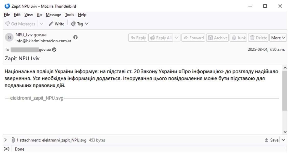 Эксперты FortiGuard Labs обнаружили целенаправленную фишинг-кампанию, в рамках которой злоумышленники выдавали себя за представителей Национальной полиции Украины. Целью атаки стала доставка на компьютеры жертв сложного вредоносного программного обеспечения, включая стилер (вредоносную программу для кражи данных) Amatera Stealer и криптоджекер PureMiner. Особенностью кампании стало использование вредоносных файлов формата SVG (масштабируемая векторная графика), которые служили точкой входа в многоступенчатую цепочку заражения.