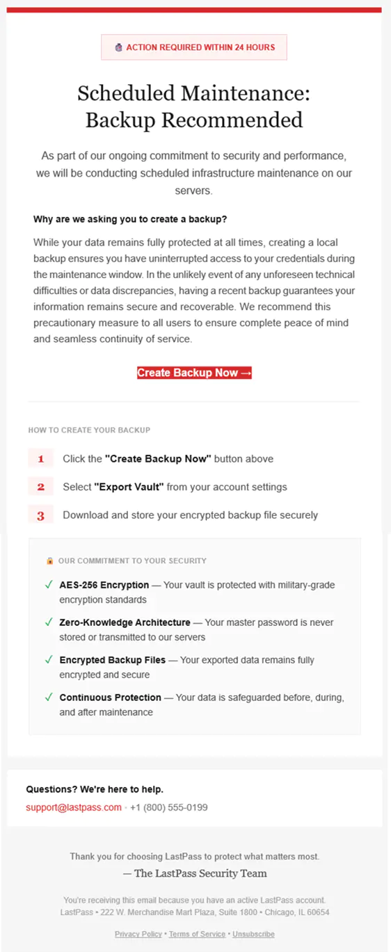 В этих письмах создается искусственное ощущение срочности, типичный прием социальной инженерии. Тема письма и отправитель постоянно меняются. Основное сообщение утверждает, что LastPass в ближайшие 24 часа проведет плановое техническое обслуживание, и для безопасности данных пользователям необходимо срочно создать резервную копию своих хранилищ. Компания LastPass официально заявляет, что не рассылала таких запросов и не планирует срочного обслуживания, требующего ручного резервного копирования со стороны клиентов.