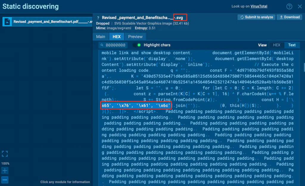 Внедренный JavaScript выполняет рутину декодирования с помощью операции XOR. Этот процесс восстанавливает настоящий код редиректа, который затем исполняется с помощью функции "eval". В среде песочницы ANY.RUN этот процесс полностью виден. Аналитики могут изучить переменные декодера, экранированные байты (например, '\x65','\x76') и восстановленный скрипт в статическом или HEX-представлении. Это позволяет извлечь декодированный вредоносный код (полезную нагрузку) и детально проанализировать команды, которые выполняет SVG.
