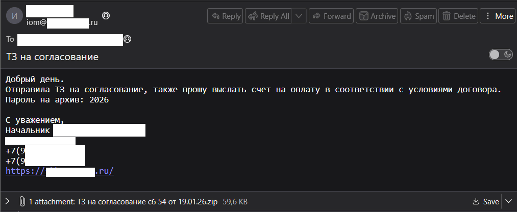 Целями январской рассылки стали организации из сфер жилищно-коммунального хозяйства, финансов, городской инфраструктуры, аэрокосмической отрасли, химической промышленности и электронной коммерции. Используя скомпрометированные легитимные почтовые адреса, злоумышленники рассылали письма с темой «ТЗ на согласование». В качестве вложения предлагался архив, содержащий два файла: документ Microsoft Word и ярлык (LNK-файл). При этом сам файл с расширением .doc на самом деле являлся RAR-архивом, маскирующим вредоносную нагрузку (payload).