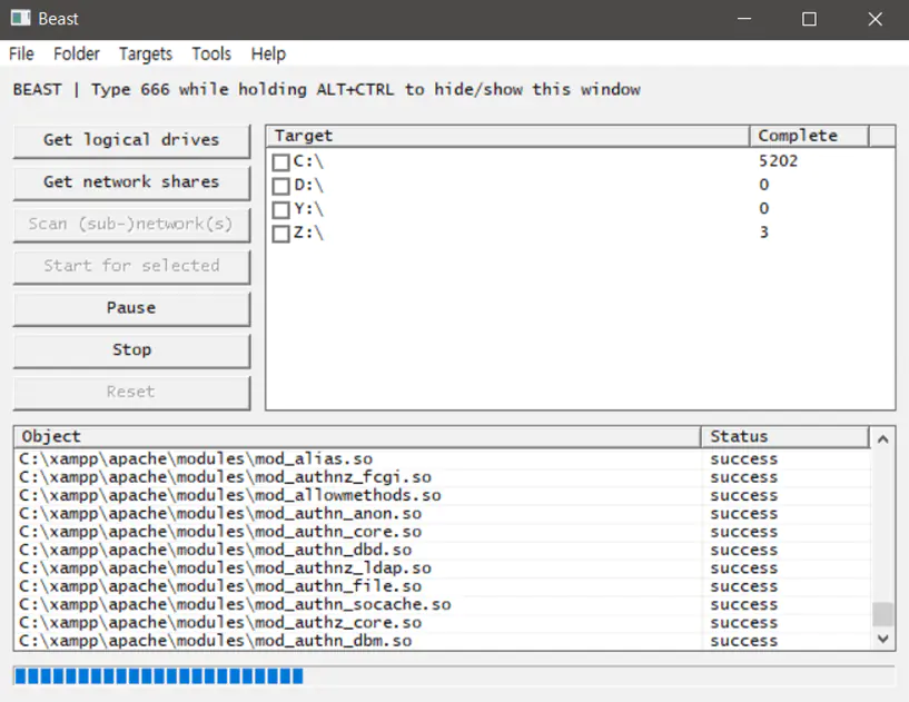 Уникальной особенностью Beast является графический интерфейс, активируемый в режиме отладки комбинацией клавиш [Ctrl+Alt+666]. Через этот интерфейс злоумышленники могут выбирать папки для шифрования, вручную выполнять функции подготовки и отслеживать прогресс шифрования в реальном времени.