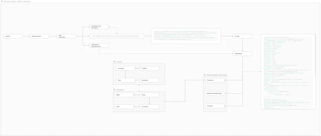 На начальных этапах атак группировка использовала фишинговые письма, маскируясь под государственные структуры, такие как Минпромторг России. Для доставки вредоносных нагрузок применялись уязвимости, включая CVE-2025-6218 и неизвестную уязвимость в WinRAR, позволяющую осуществвать Path Traversal при распаковке архивов. После получения доступа в систему злоумышленники загружали дополнительные модули, такие как PowerTaskel и owowa, а также агент фреймворка Mythic под названием MiRat.