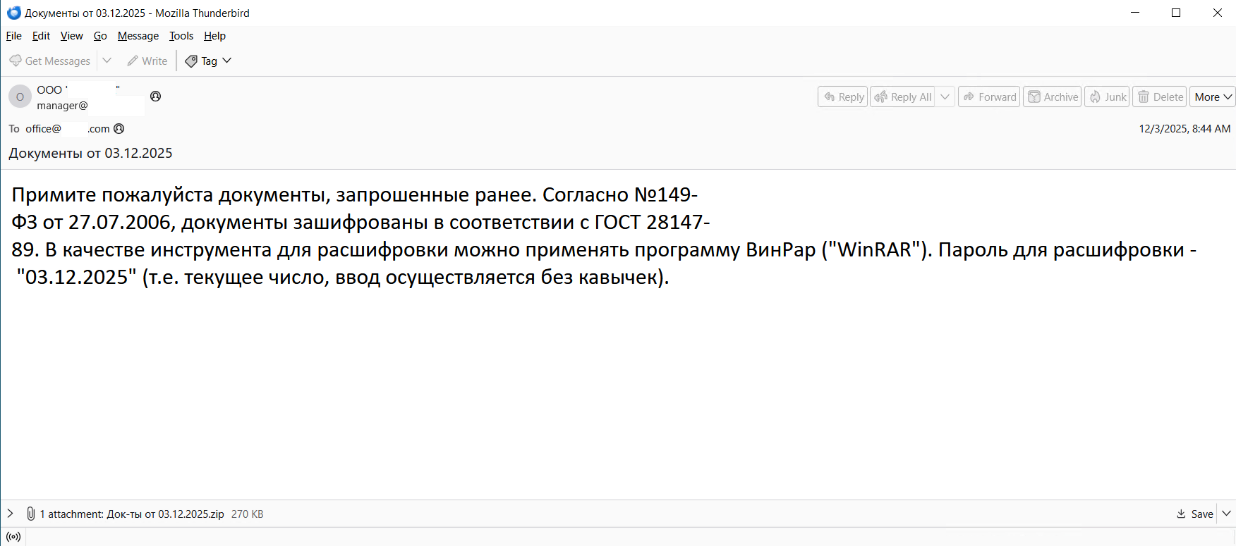 Последняя кампания не принесла значительных тактических новшеств. Механика заражения осталась прежней, что соответствует ранее задокументированным специалистами PT ESC цепочкам. Злоумышленники рассылали письма с типовой легендой, содержащие вложение с архивом. Пароль для его открытия был указан непосредственно в тексте сообщения, что является стандартным методом обхода простых почтовых фильтров.