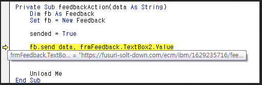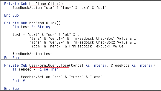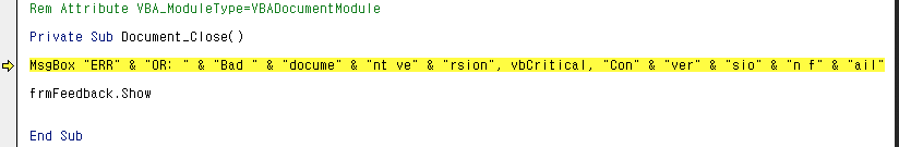 На рисунке 3 показан экран, который отображается после нажатия кнопки во всплывающем окне на рисунке 1. Как показано на рисунке 3, отображается окно формы, требующее ввода данных пользователем (шаг 2). Хотя существует всего 3 входа, которые можно сделать для закрытия формы, это входы send (btnSend_Click), cancel (btnClose_Click) и close (UserForm_QueryClose), если вы посмотрите на код макроса на рисунке 4, то увидите, что все три входа приводят к активации вредоносного поведения (feedbackAction).